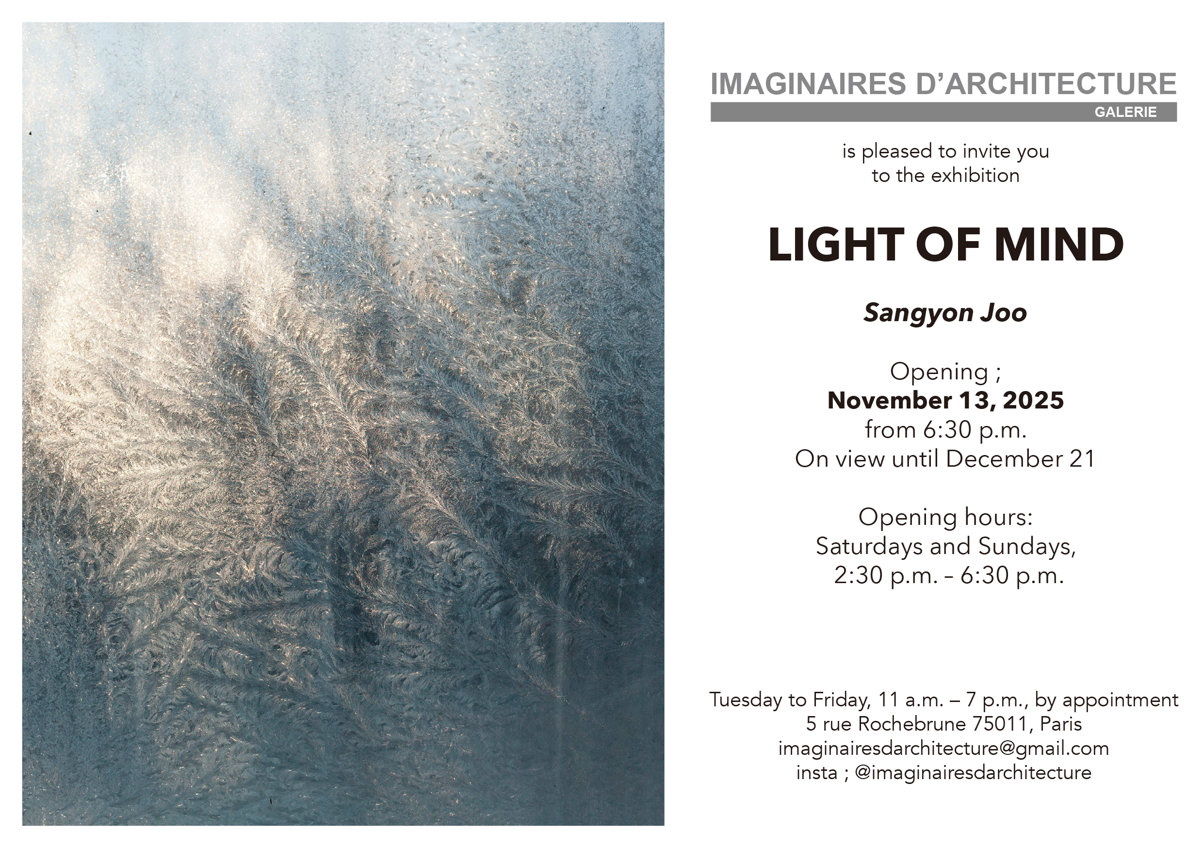 파리 마레 지구에 위치한 갤러리 Imaginaires d’Architecture에서 작가 주상연의 개인전 《LIGHT OF MIND》가 열립니다. 이 갤러리는 건축과 예술, 그리고 공간과 기억의 관계를 탐구하는 전시장으로, 올해 2쇄로 발간된 『다른 방식의 존재 연습』에 수록된 사진들이 책과 함께 전시됩니다. 닻미술관 FRAME 전시 이후, 파리에서 새로운 울림으로 이어지는 이번 전시에 파리에 계신 독자분들을 초대합니다. 더보기 >